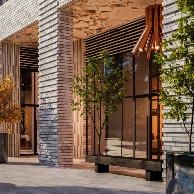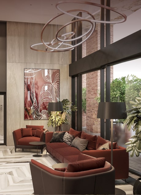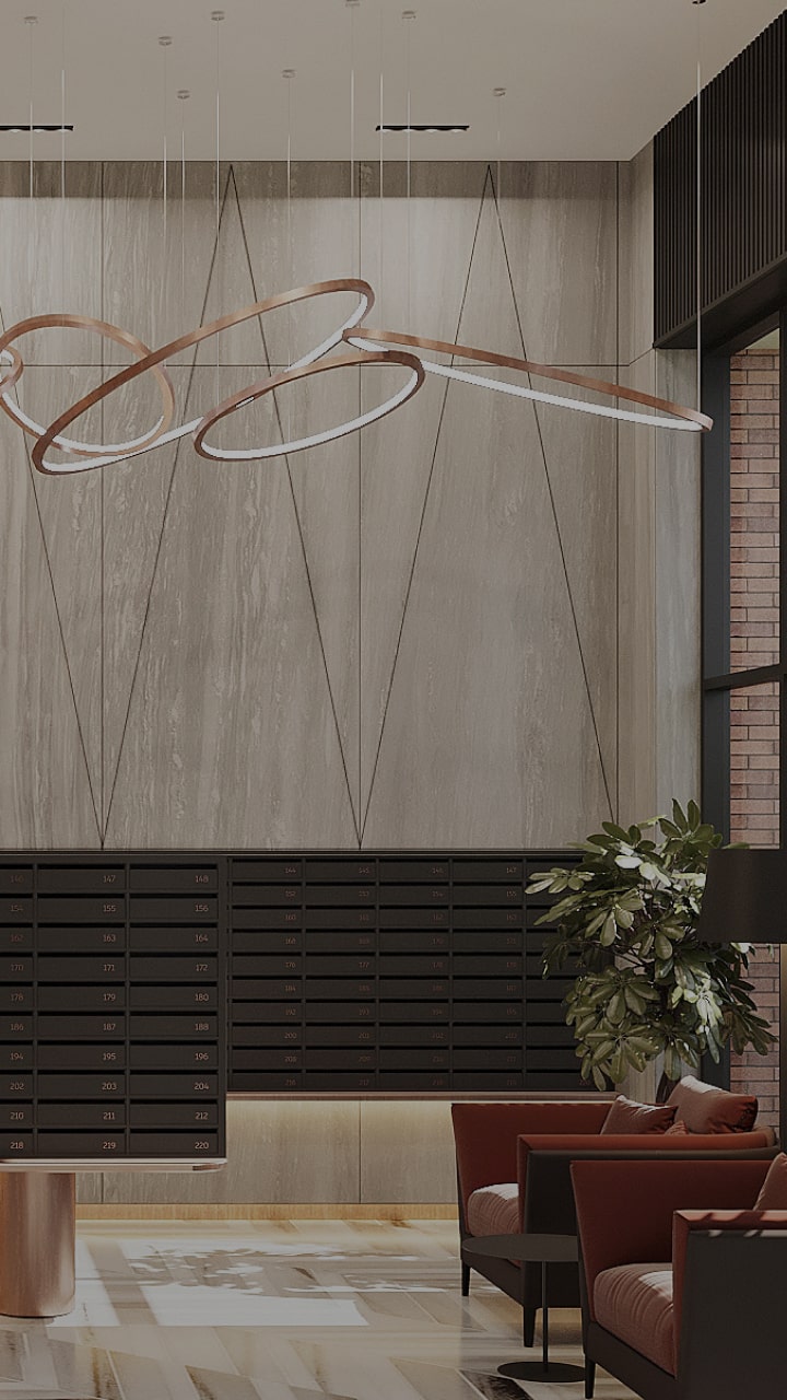 Входы в лобби утоплены в фасады корпусов и скрыты за изящной колоннадой. Летним утром здесь удобно ждать, пока ваши домашние соберутся и спустятся на прогулку. Вечером – приятно устроиться на уличном диване и почитать в круге света от роскошной люстры. Днем – рассмотреть в деталях потолки галереи, украшенные уникальными панно с текстурой минерала оникса.