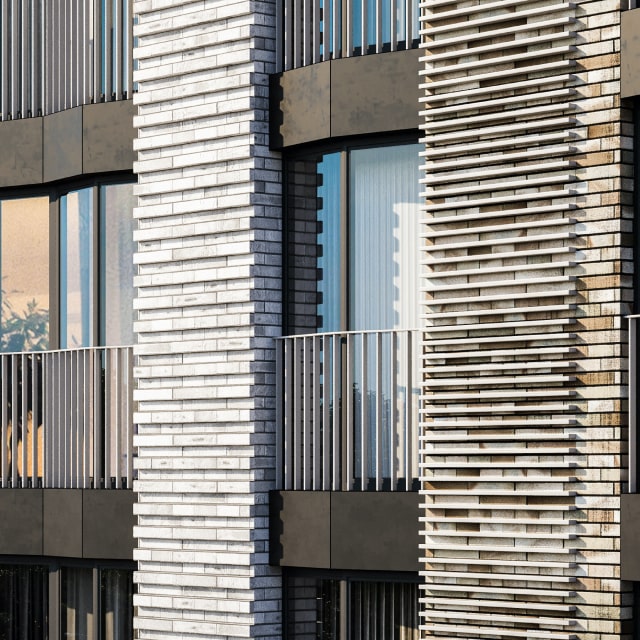 Современные, качественные материалы фасадов, фигурная кладка, французские балконы и просторные открытые террасы. Фасады индивидуальны для каждой из башен, но выполнены в общей концепции.