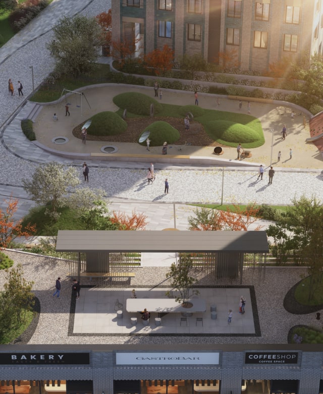 Единый, неразрывный двор с мостом, проходящий над пешеходной торговой улицей. Уникальные арт-объекты, многофункциональные перголы для отдыха и игр детей, природные амфитеатры, городские балконы, секретный и дзен-сады, детский игровой маршрут.