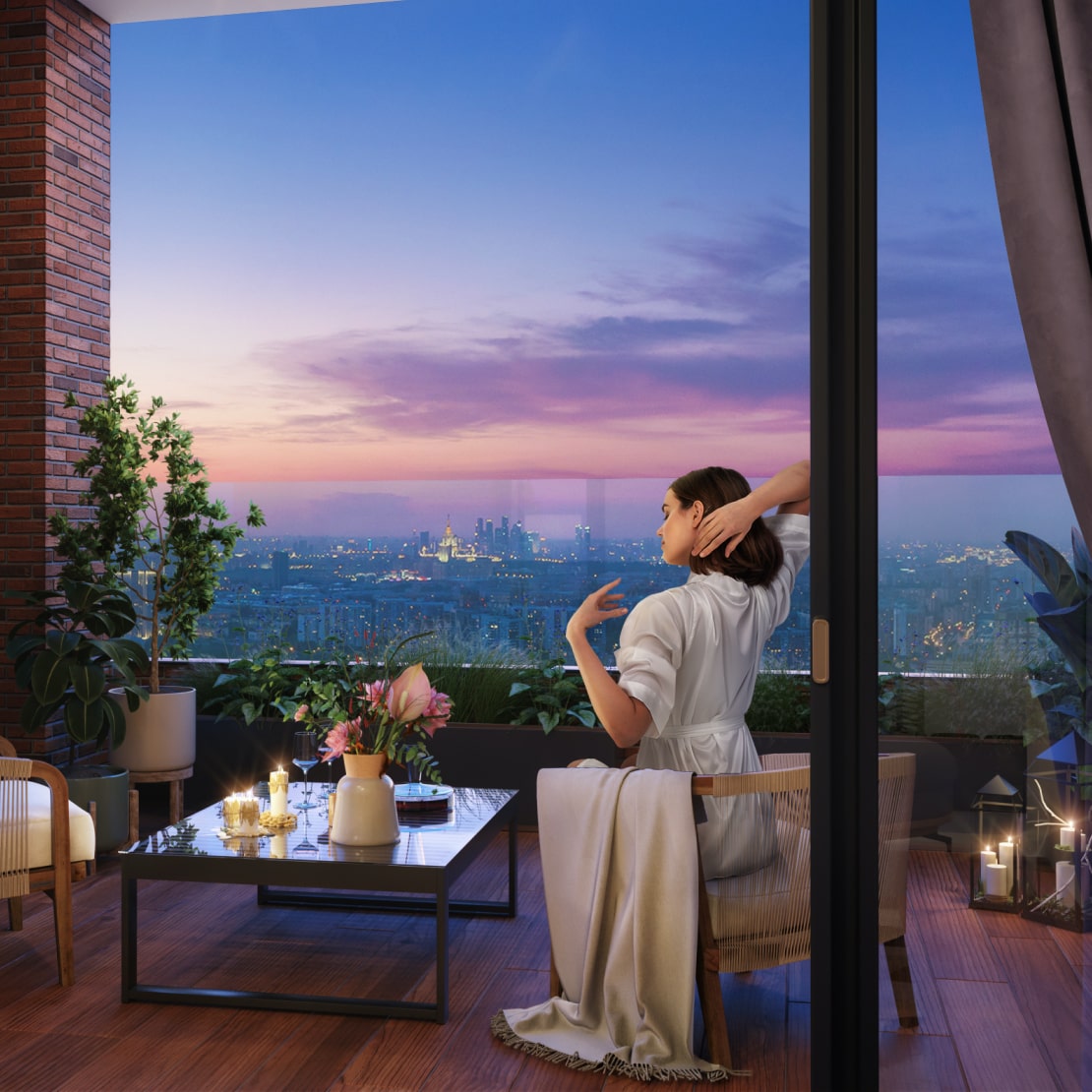 Как остаться наедине с городом, если кроме вас в нем проживают еще 12 миллионов человек? Купить в EVER квартиру с приватной террасой площадью до 10 кв.м. Вас не увидят даже соседи: все террасы встроены в объем здания и не выступают за границу фасада. Здесь — только вы и город. И вечное лето — если вы решите устроить на террасе зимний сад.