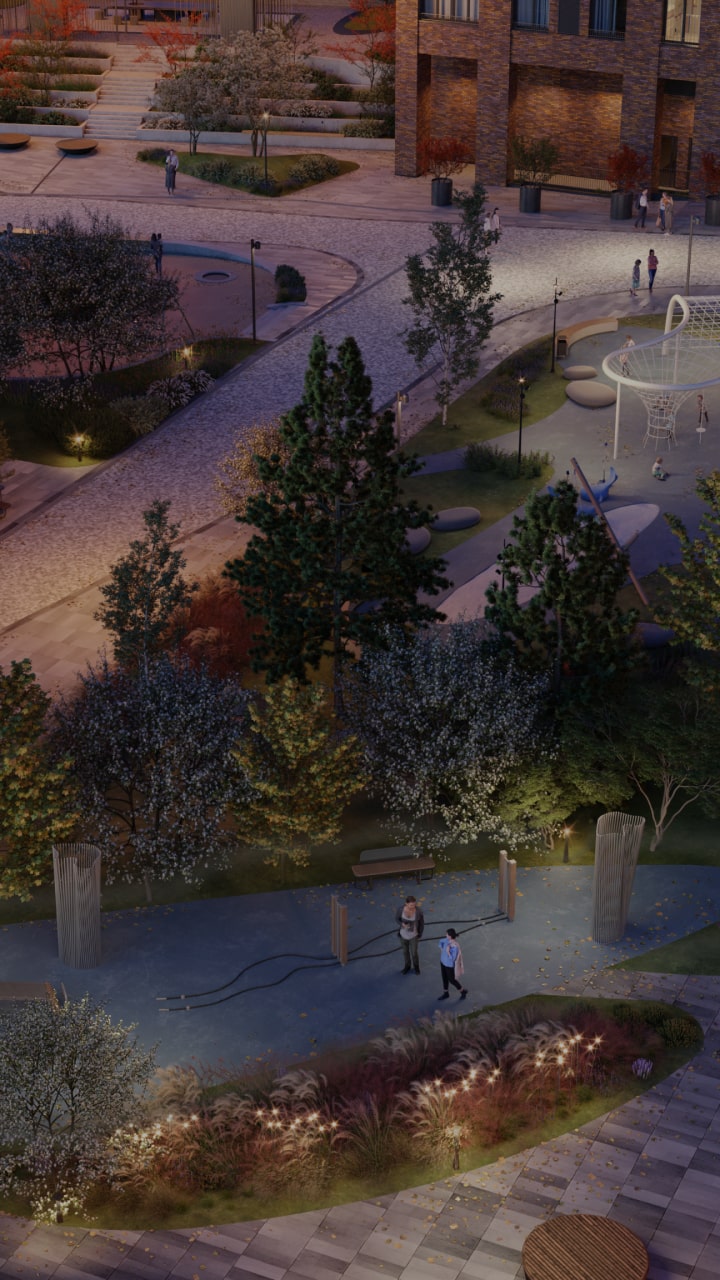 Здесь можно шептаться на лавочке под мягким светом подвесных люстр. Можно любоваться фигурной кирпичной кладкой. Можно встречаться с друзьями в рассеянном свете перголы. Или гулять за ручку по темным тропинкам, лишь кое-где подсвеченным городскими торшерами.