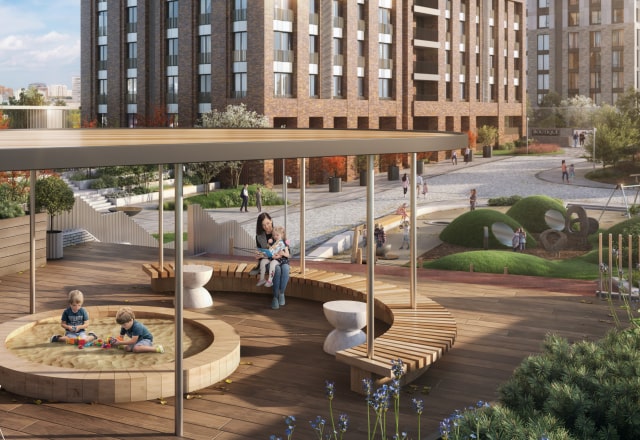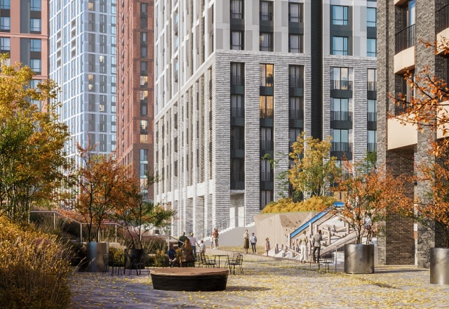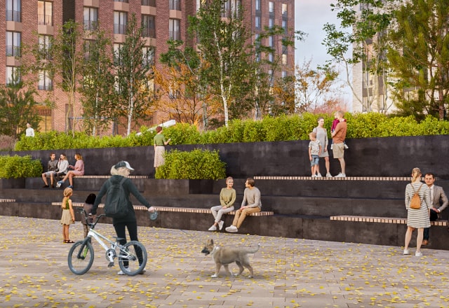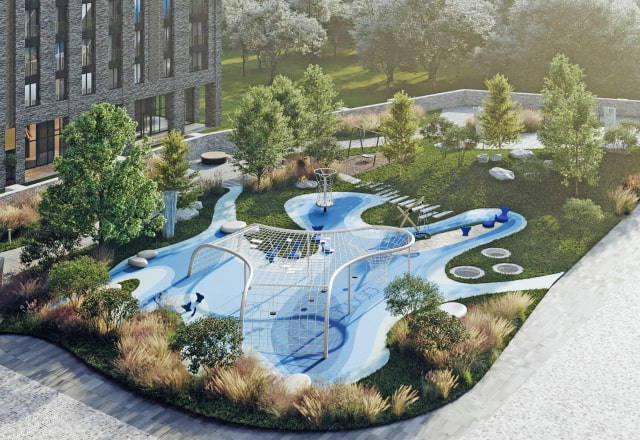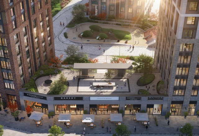 Под поверхностью разноуровневого двора скрываются коммерческие и технические помещения – а гуляющие жители видят лишь природные холмы.