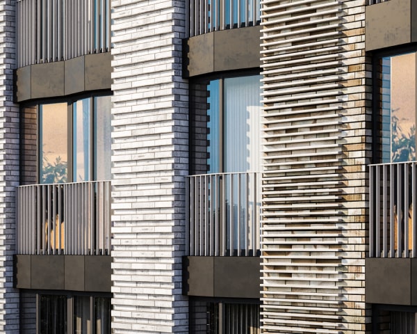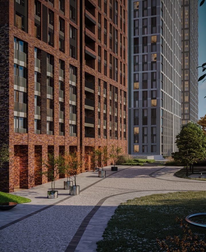 Современные, качественные материалы фасадов, фигурная кладка, французские балконы и просторные открытые террасы. Фасады индивидуальны для каждой из башен, но выполнены в общей концепции.