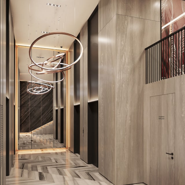 Входы в лобби утоплены в фасады корпусов и скрыты за изящной колоннадой. Летним утром здесь удобно ждать, пока ваши домашние соберутся и спустятся на прогулку. Вечером – приятно устроиться на уличном диване и почитать в круге света от роскошной люстры. Днем – рассмотреть в деталях потолки галереи, украшенные уникальными панно с текстурой минерала оникса.