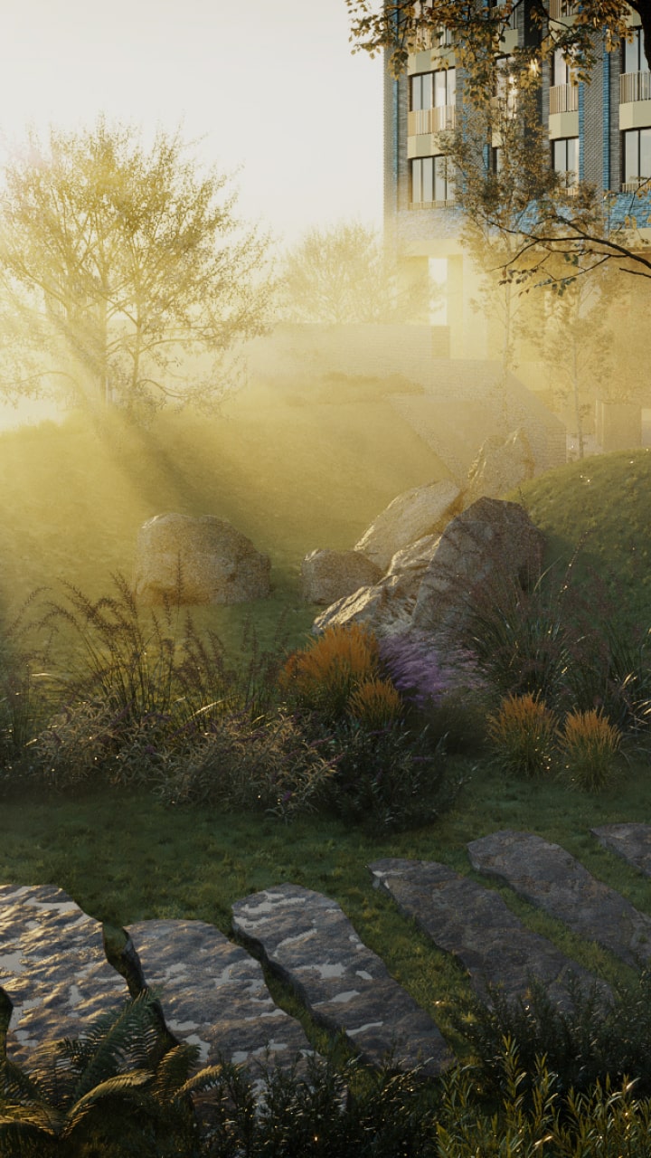 Единый, неразрывный двор с мостом, проходящий над пешеходной торговой улицей. Уникальные арт-объекты, многофункциональные перголы для отдыха и игр детей, природные амфитеатры, городские балконы, секретный и дзен-сады, детский игровой маршрут.